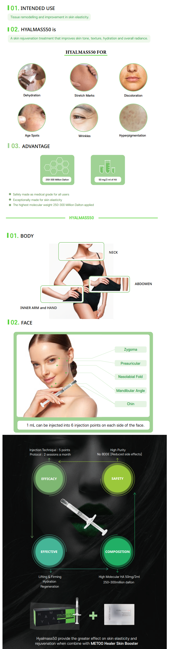 Hyalmass 50 boasts one of the highest concentrations of HA (50mg / 2ml), which allows it to deeply boost the hydration of the skin and reverse aging and sagging skin, especially in the face, neck, and hands with little-to-no downtime.