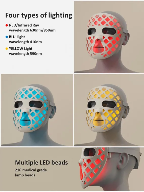 The wearing face mask comes with an adjustable nylon buckle strap that allows you to wear the mask comfortably. Before putting on the mask, we can get the strap going through the entrance hole on the other side of the mask and wrap the strap around the head for easy fitting. LED light therapy mask is a wearable light therapy beauty device. The surface frame of this product is made of liquid silicone, convenient and easy to use, foldable and portable, it can be fit well by adjusting the nylon buckle for the different people. The mask installed with 54 four-in-one beads emits 4 wavelength colours : red/infrared light/blue/yellow lights. It can be adjusted by the controller to get 4 lights with different energies and different illuminable durations. Based on the theory of phototherapy, this product can penetrate deeper into the skin, stimulates the production of collagen and elastin cells when irradiated with light and liquid , and achieves the effect of beautifying the skin.